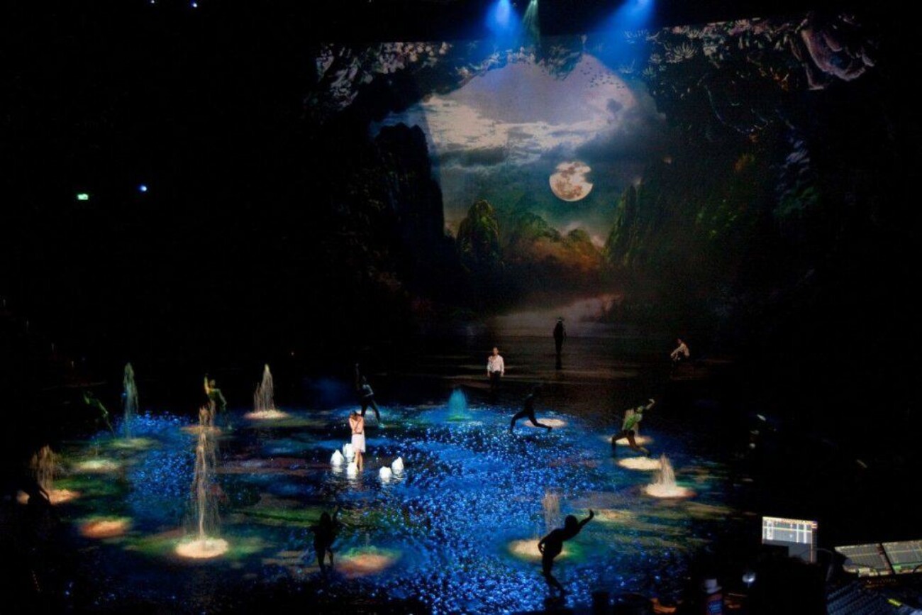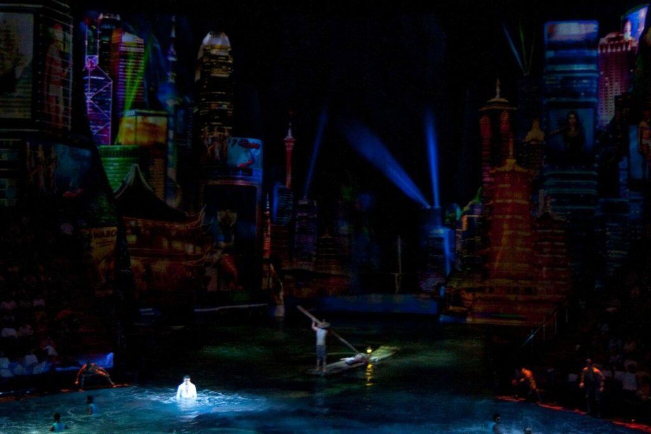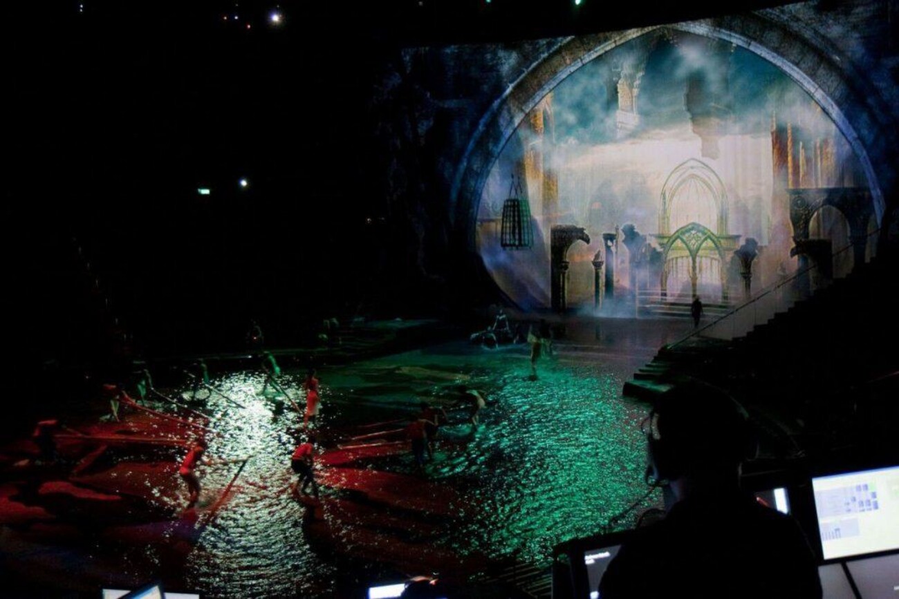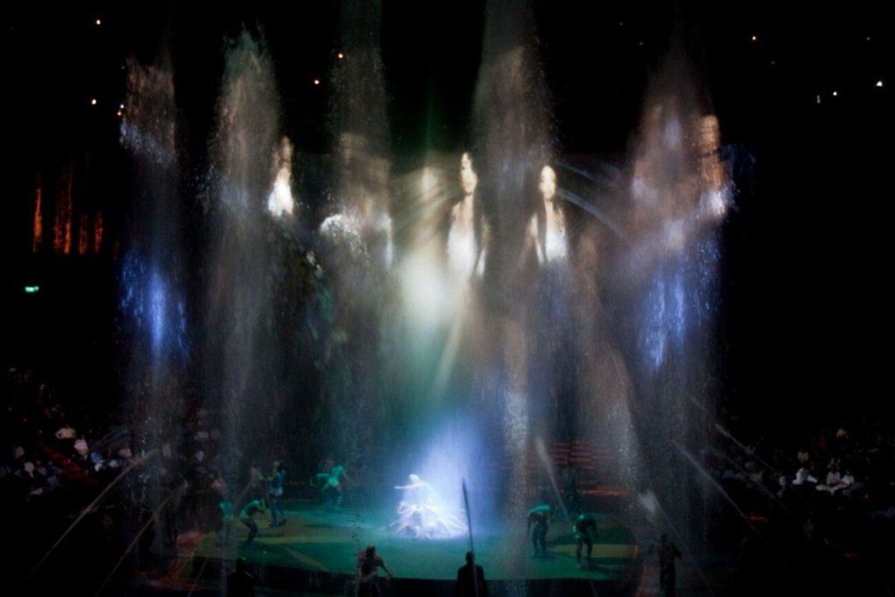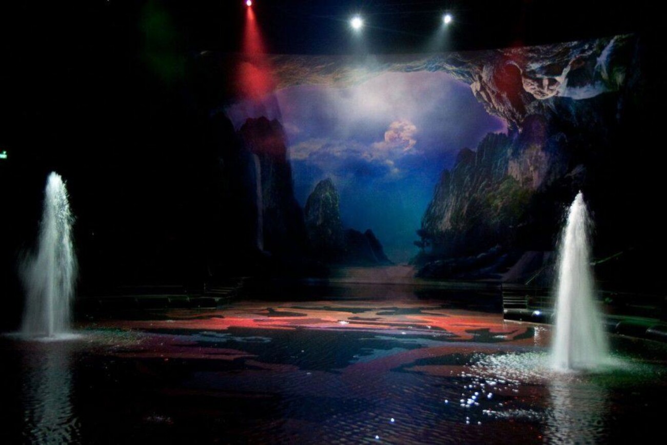 In addition to the four fixed projectors displaying the show’s gigantic backdrop, there were 10 Barco DML-1200 projectors that moved from one unexpected surface to the next: from skimming the water’s surface, to dancing amid water jets shooting through the air, to navigating through objects made from chain mail, and more.