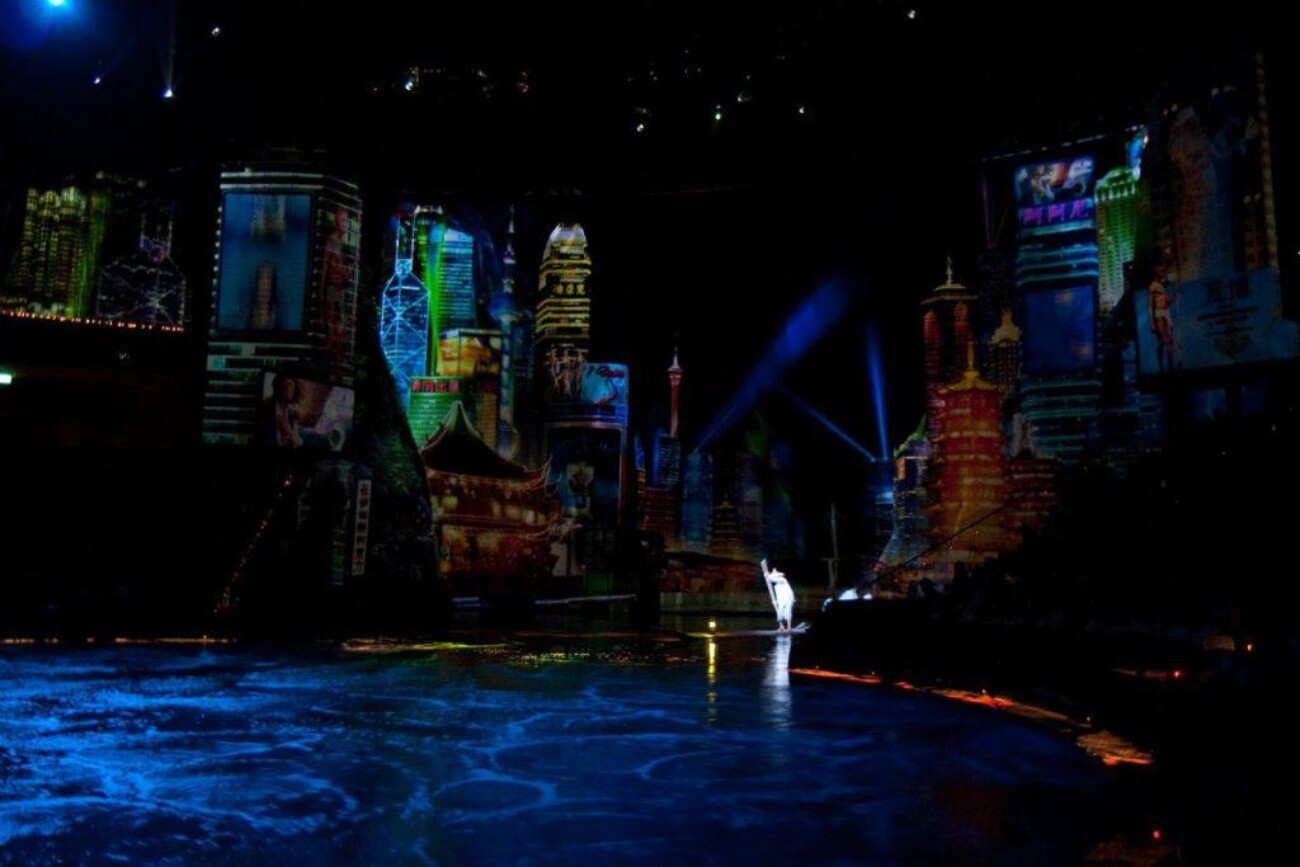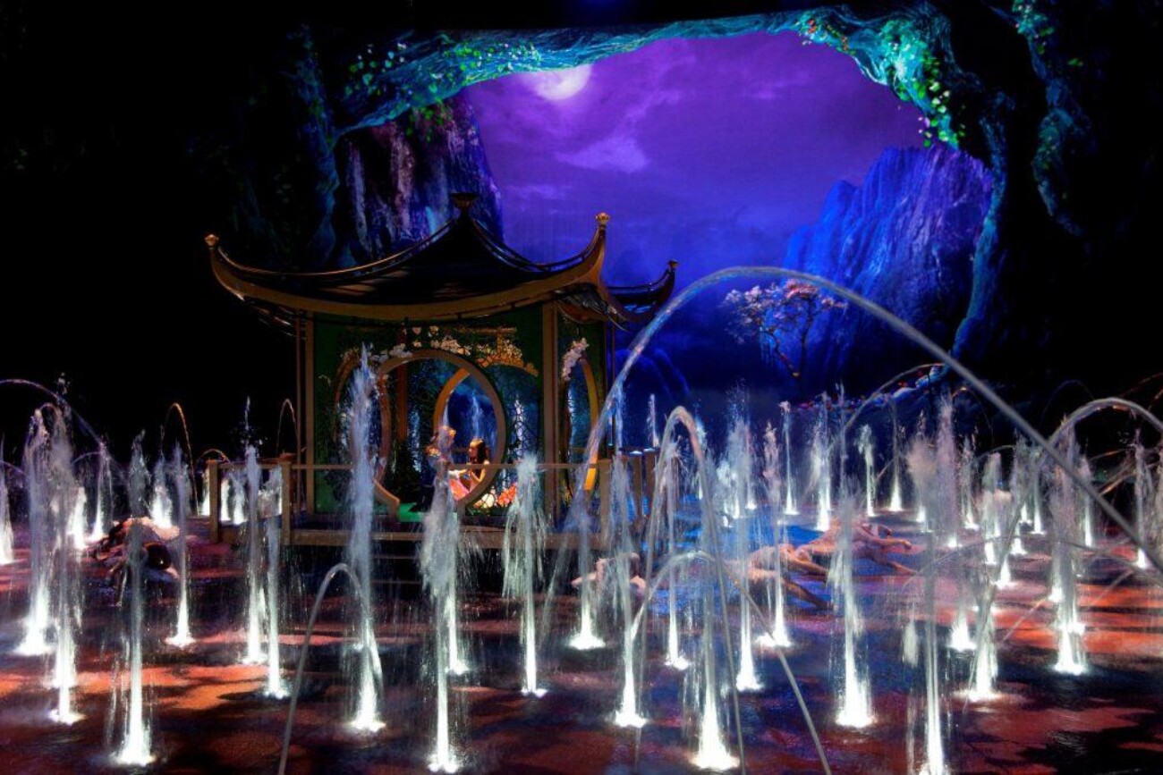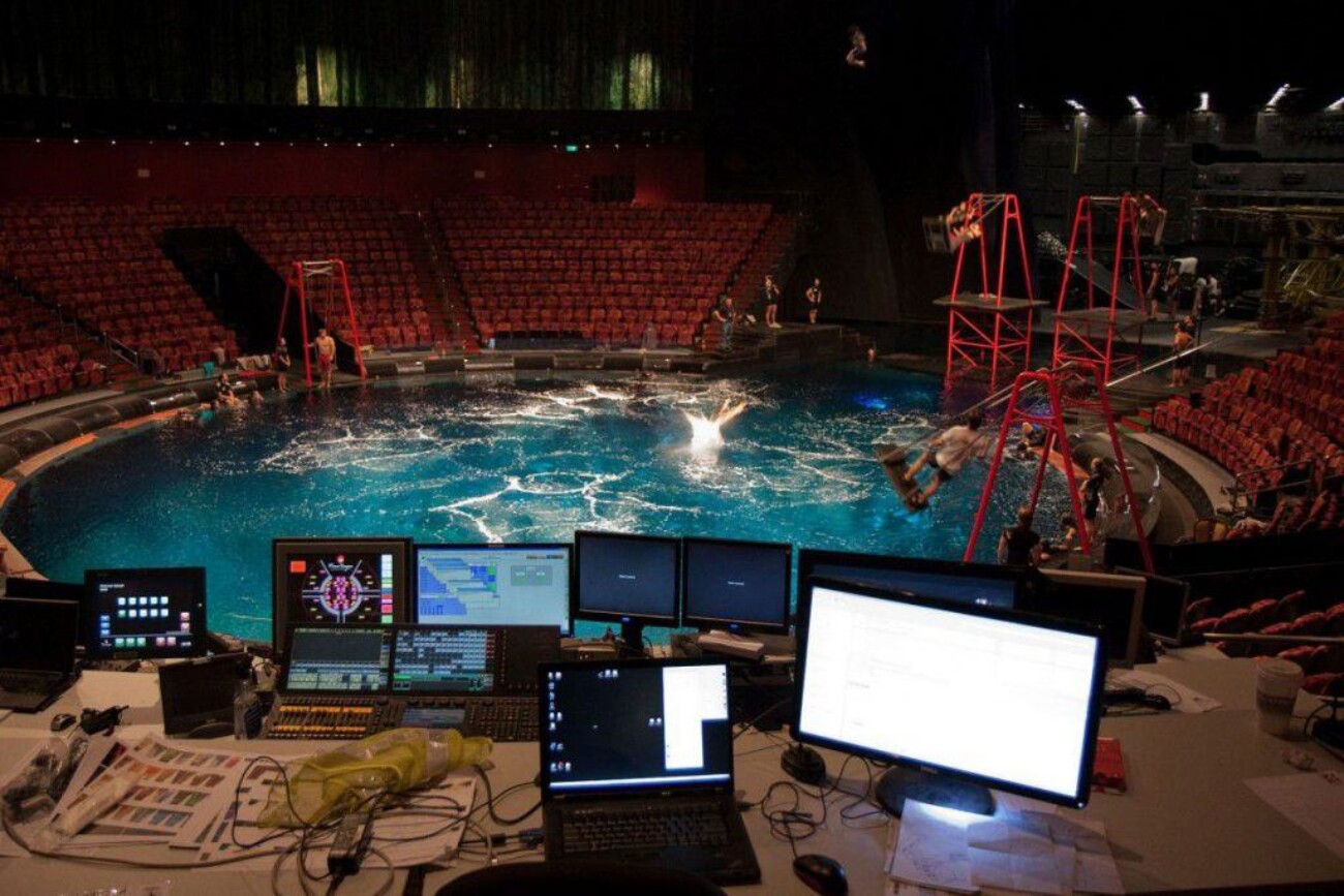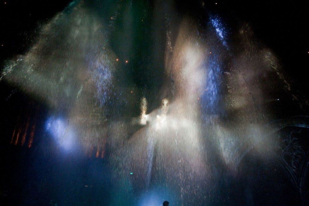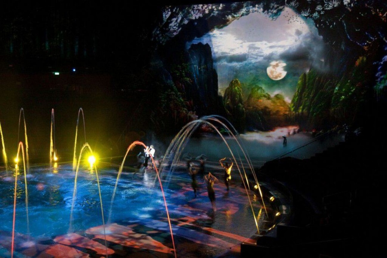 In addition to the four fixed projectors displaying the show’s gigantic backdrop, there were 10 Barco DML-1200 projectors that moved from one unexpected surface to the next: from skimming the water’s surface, to dancing amid water jets shooting through the air, to navigating through objects made from chain mail, and more.
