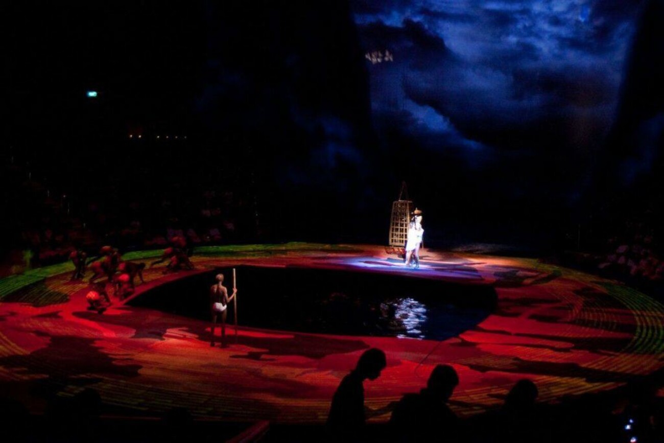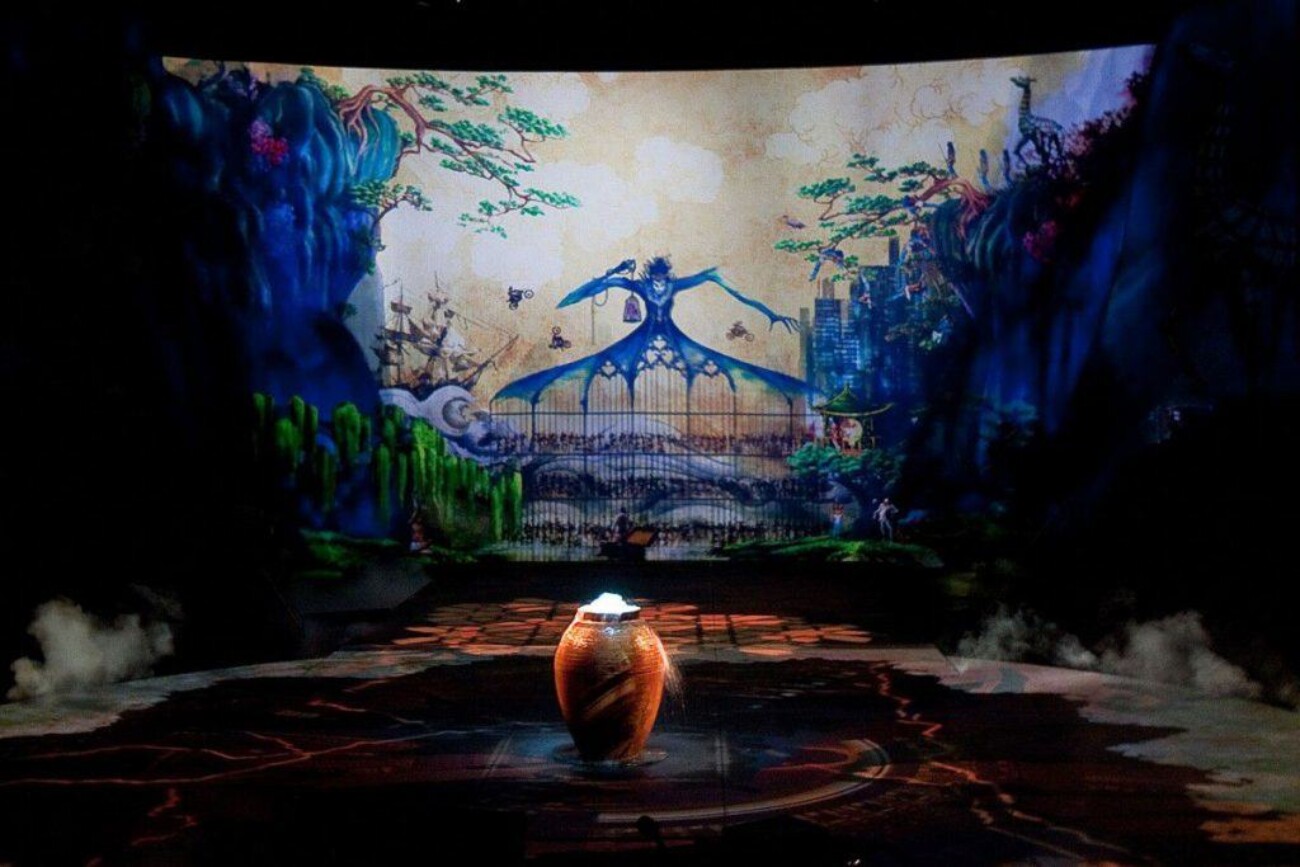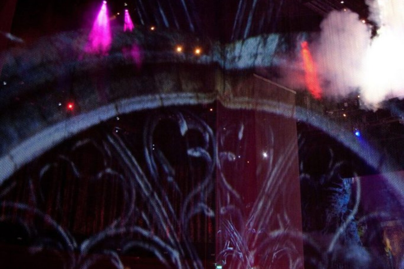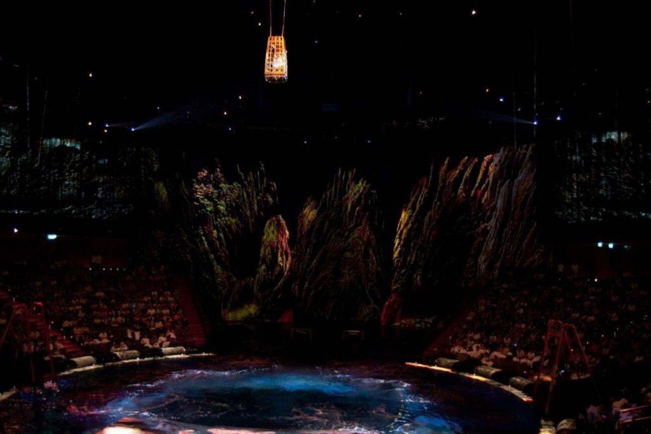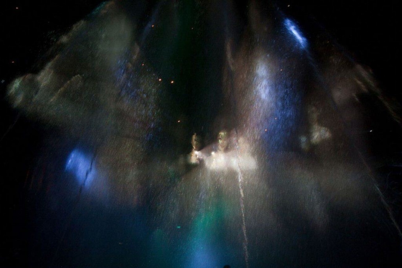 In addition to the four fixed projectors displaying the show’s gigantic backdrop, there were 10 Barco DML-1200 projectors that moved from one unexpected surface to the next: from skimming the water’s surface, to dancing amid water jets shooting through the air, to navigating through objects made from chain mail, and more.