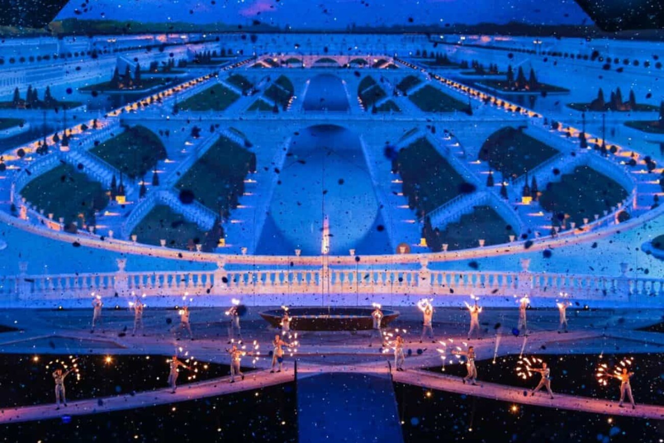 Selon la première conception de la scène, la surface de projection consistait en un tissu vaporeux qui recouvrait le fond et le plancher d’une scène qui occupait la moitié du stade. Pour respecter ces spécifications, Creative Technology (CT) avait proposé 78 projecteurs Panasonic DZ21 reliés par un réseau de serveurs média Photon. Après les premiers essais, il a été décidé que le tissu utilisé serait en fait un tissu blanc opaque et qu’il faudrait 40 projecteurs supplémentaires.
