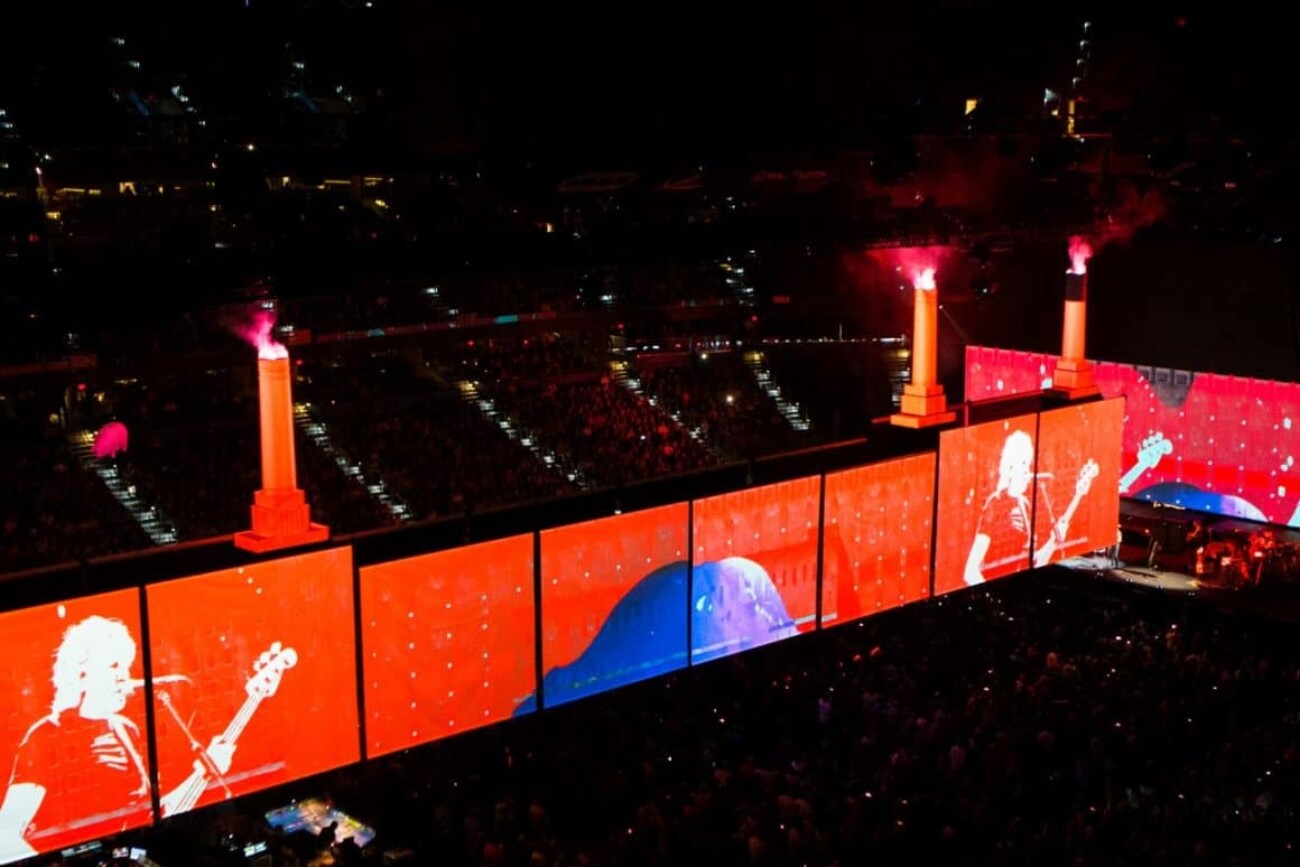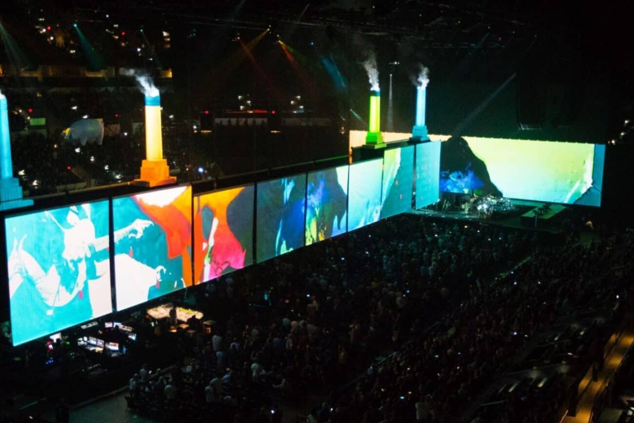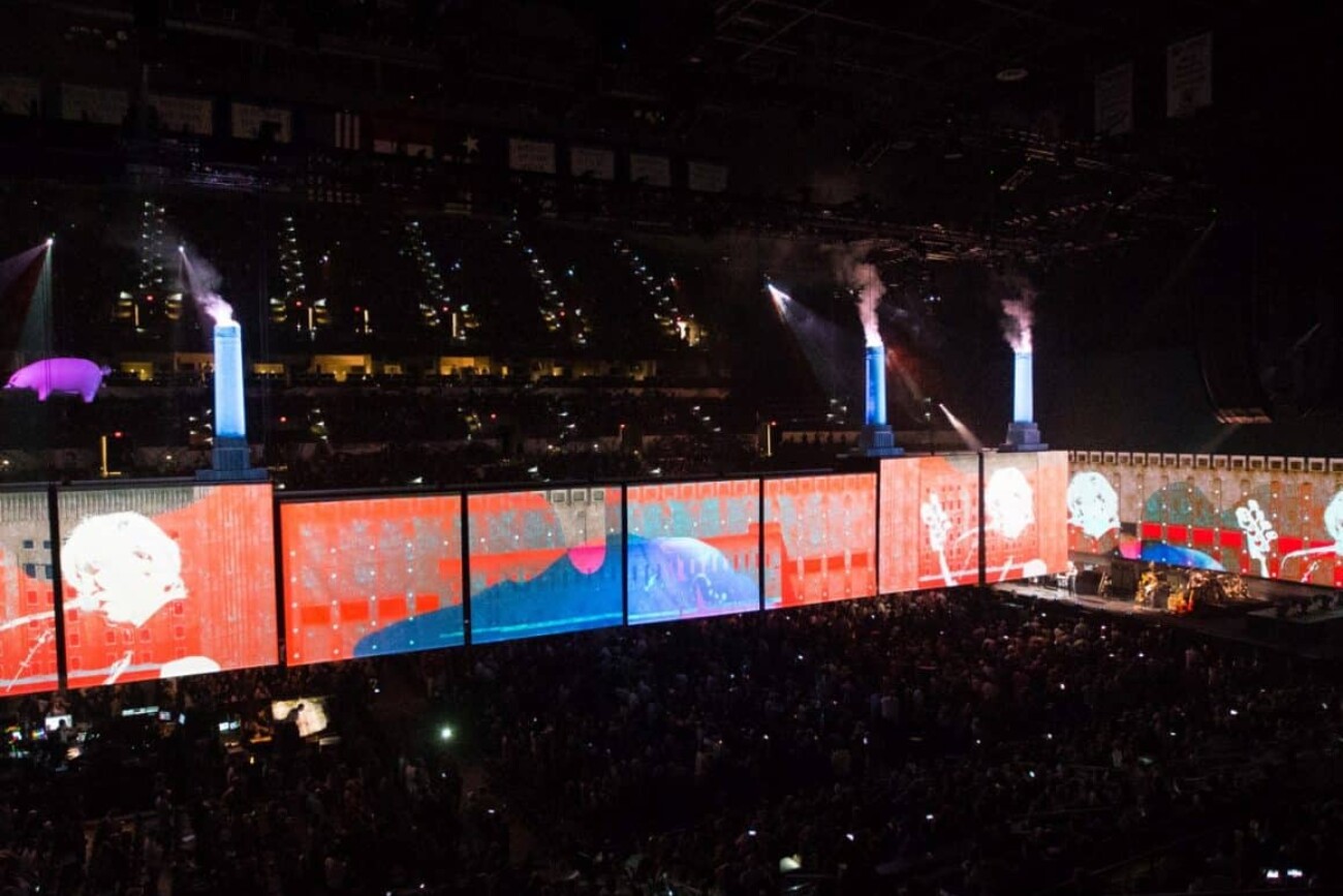 En mai 2017, Roger Waters a lancé sa tournée Us+Them. Ce spectacle compte plus de 20 surfaces de projection, notamment quatre cheminées gonflables, d’immenses écrans déroulants et un cochon volant propulsé par un drone. Les projections vidéo et les écrans à DEL de 6K s’intègrent à la perfection au contenu vidéo HD pré-rendu et non compressé avec des effets en temps réel, appliqués en direct au signal provenant des caméras.