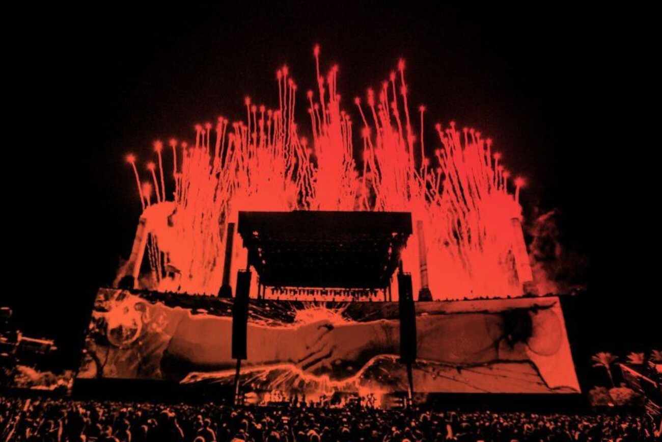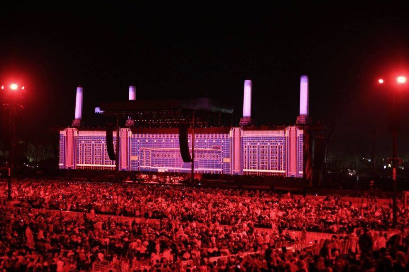 In the middle of the performance, four 13m inflatable Battersea smokestacks rose majestically atop an LED screen (66 x 12 m, resolution 8512 x 1280 px), and featured Algie the Pig hung between two of them, recreating the 1977 album cover.