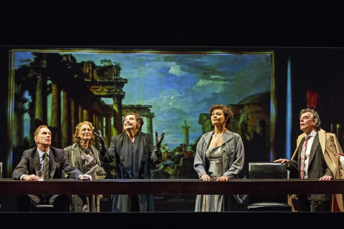 The production made use of live video capture to create a televisual environment that was rear-projected against a backdrop engulfing the whole stage. This synthetic video scenery was built with the help of multiple cameras integrated in the set and composited live to generate a hybrid between a Roman forum and a televised newscast.