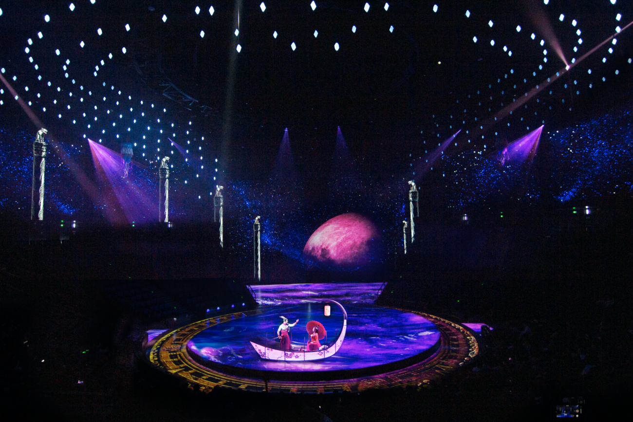 To truly immerse the audience in the world of Xi Shi, the high-resolution graphics needed to interact seamlessly with the few physical elements: stage, floor, and a central, rotating lift. Every camera, projector, and screen had to be impeccably coordinated and calibrated.